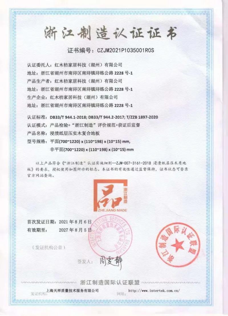 捷報!紅木枋地板喜獲“浙江制造認證證書(shū)”